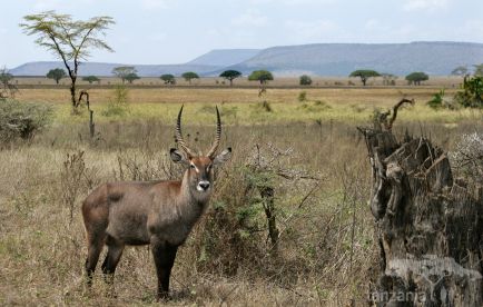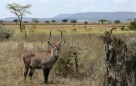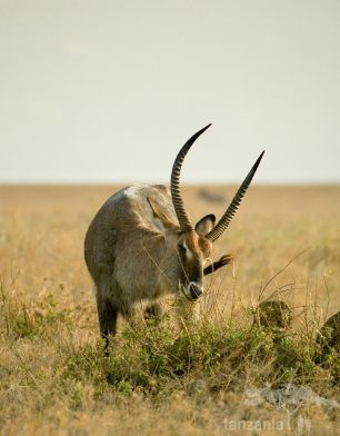 The stockier waterbuck is easily recognised by its shaggy brown coat and the male’s large lyre-shaped horns. The western Defassa race has a full white rump, while its eastern counterpart has a white U, as if it sat on a freshly painted toilet seat. Small herds are common in the vicinity of standing water, particularly in Arusha, Manyara and Selous.