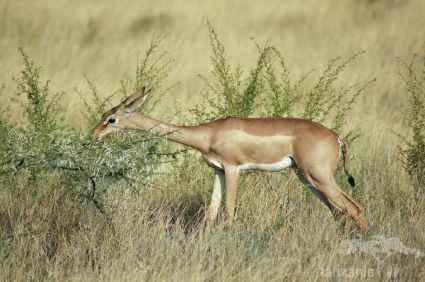 The gerenuk looks like a cross between a gazelle and an impala, but can distinguished from either by its extraordinarily long neck (as reflected in the Swahili name ‘swala twiga’, meaning ‘gazelle giraffe’) and unique custom of standing on its hind legs to eat. Within Tanzania, its range is restricted to Mkomazi and Tarangire.