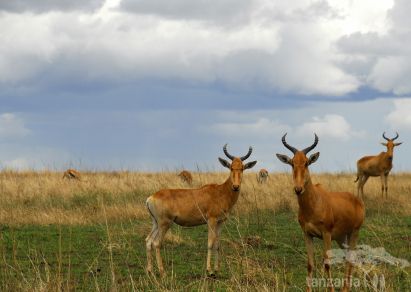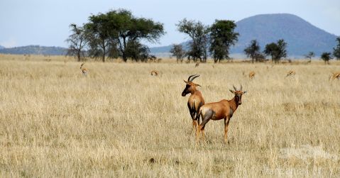 Related to the blue wildebeest, the hartebeest has large shoulders, a pale yellowish coat, stunted horns, and an elongated face that gives it a rather morose demeanour. Coke’s hartebeest (also known as the kongoni) is often seen atop a termite mound scanning the Serengeti plains for predators. It is replaced by the endangered Liechtenstein’s hartebeest in southern Tanzania.