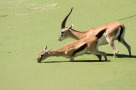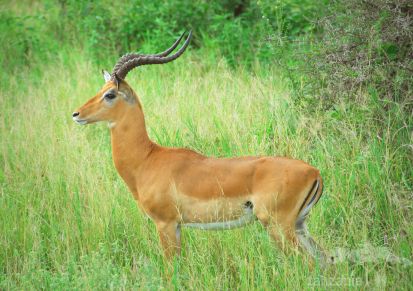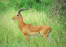 Superficially gazelle-like but more closely related to wildebeest and hartebeest, the impala is an elegantly proportioned chestnut antelope with black and white rump stripes. The male has magnificent lyre-shaped horns. Gregarious and territorial, the impala often moves in herds of 100 or more, though bachelor groups are smaller. Herds jump magnificently – up to 3m high and 10m in length – in all directions when disturbed, a strategy designed to confuse predators. The most numerous antelope in southern Tanzania, it is also common in lightly wooded habitats in the north, but absent from Ngorongoro Carter.