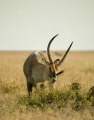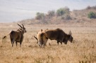 Africa’s largest antelope, the eland has a shoulder height of 150–180 cm and can weigh up to 950 kg. A somewhat atypical Tragelaphine, it has a rather bovine appearance accentuated by relatively short horns and a large dewlap, and its light tan coat has faint vertical stripes. Eland herds typically number 10-15 animals, but seasonal migrations may involve several hundred animals. Thinly but widely distributed in East Africa, it is difficult to approach closely, an essential defence strategy for a relatively slow-moving antelope of open habitats. It might be seen almost anywhere, but Serengeti, Ngorongoro and Mikumi are the most reliable spots.