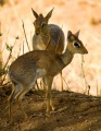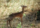 The duiker-like steenbok has red-brown upper parts, clear white underparts, short straight horns, and is normally encountered singly or in pairs, which turn to stone when disturbed (hence its name, which translates as ‘stone buck’). It is common in the Serengeti and surrounds, but rare or absent further south.