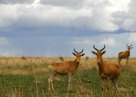 The oribi is a widespread but localised grassland antelope with sandy upperparts, white belly, and a diagnostic black glandular patch below the ears. It is typically seen in pairs or small herds which draw attention to itself with a trademark sneezing alarm call.